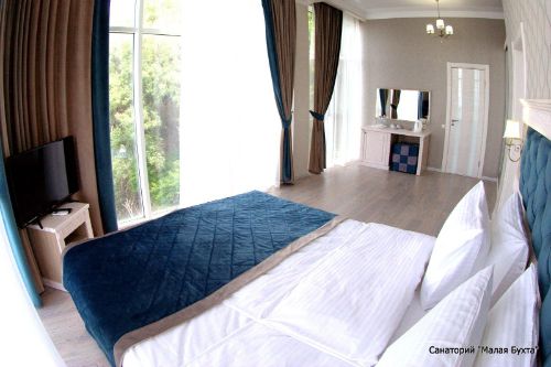 Санаторий «Малая бухта» представляет собой современный оздоровительный комплекс, созданный для комфортного отдыха, лечения и насыщенного досуга гостей курорта. Учреждение имеет категорию три звезды и способно одновременно разместить более тысячи человек. Для проживания предусмотрено четыре гостиничных корпуса, где каждый номер оборудован в соответствии с международными стандартами и полностью укомплектован для удобства гостей, предусмотрены разные категории размещения. Снять номер в санатории возможно онлайн, подробную информацию можно уточнить, обратившись в информационный центр.
